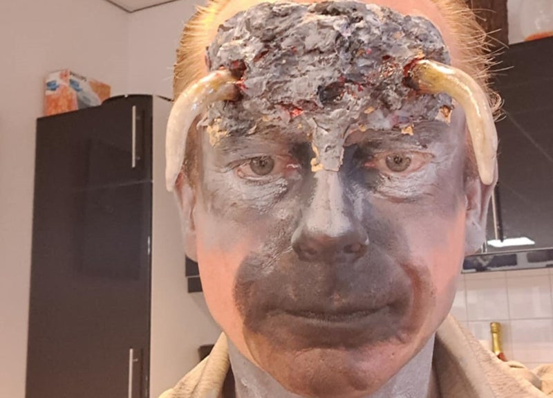 Het idee was om mijn gezicht daarna ruw op te bouwen met lava-achtige structuren, afgemaakt met zwart, grijs en nepbloed.